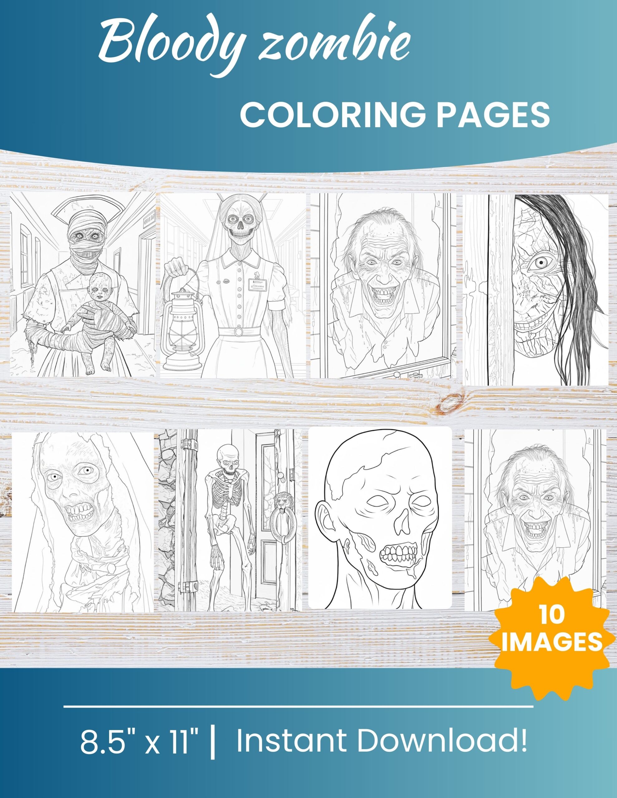 • 10 printable black & white PDF pages featuring playful zombies